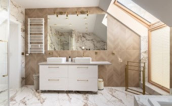 Wyposażenie łazienki kabina prysznicowa, lustro, umywalka, wanna, WC