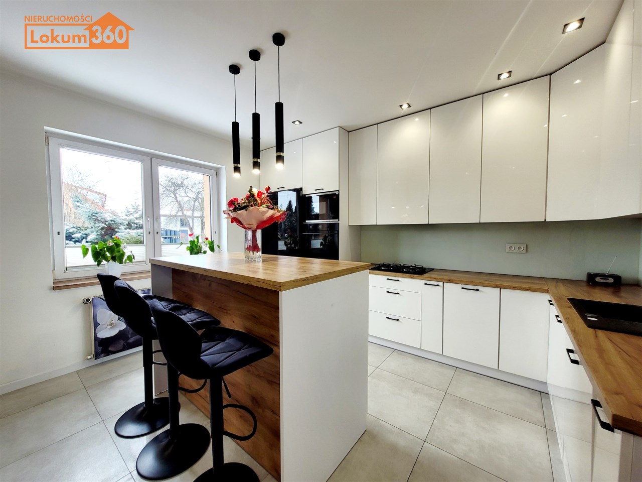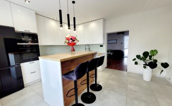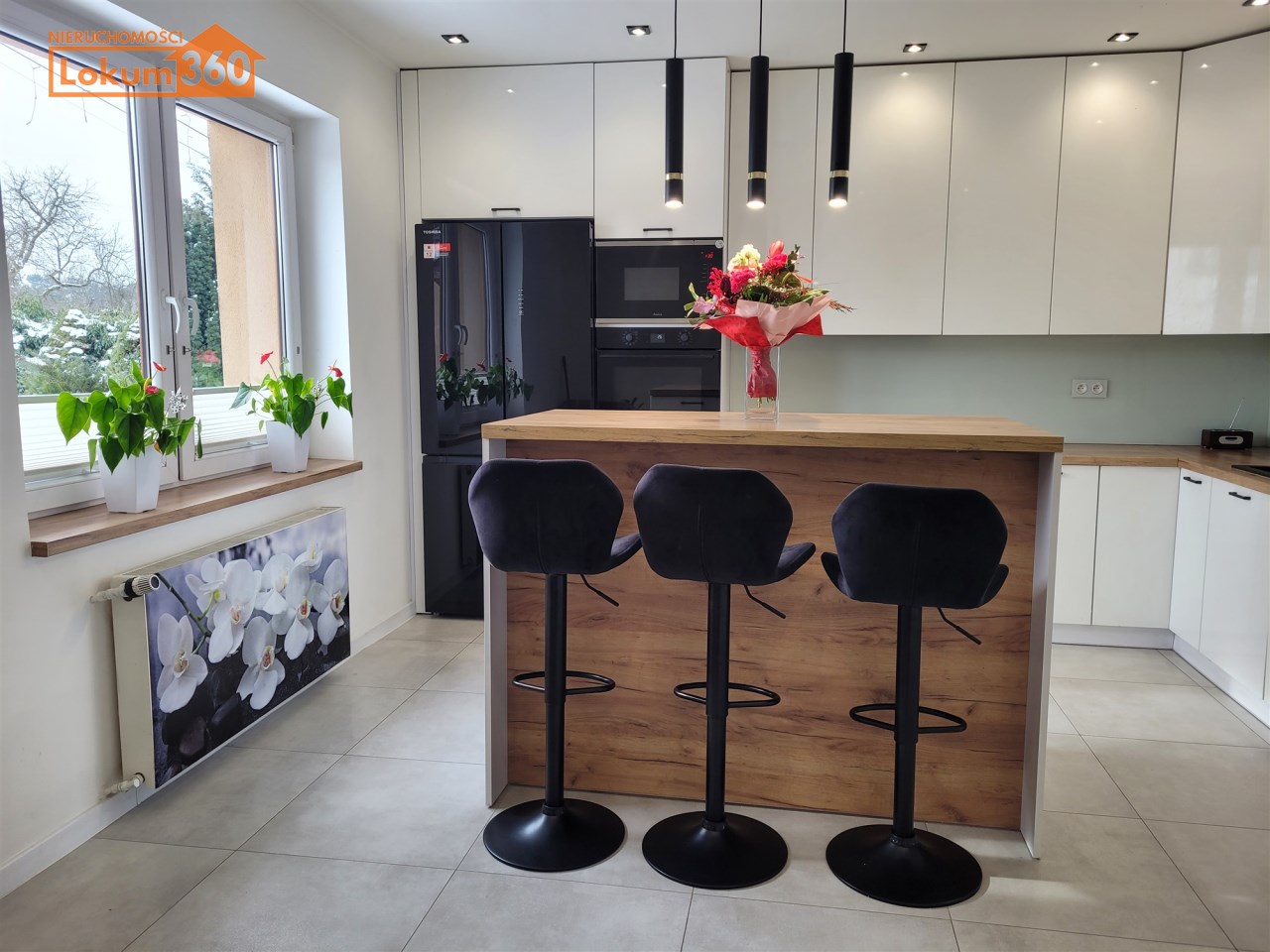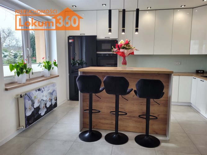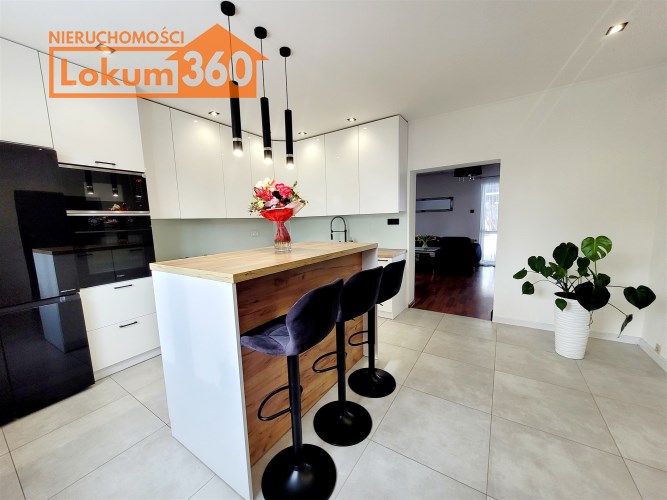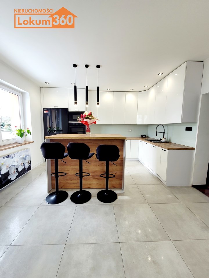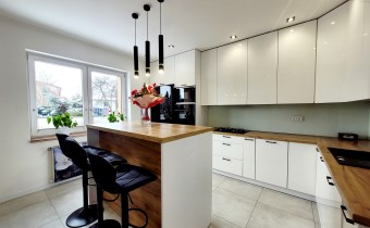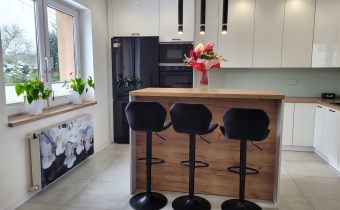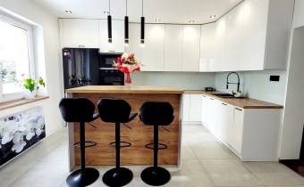 - Duża jasna kuchnia, w której na środku znajduje się nowoczesna ,,wyspa" oraz funkcjonalna zabudowa meblowa ze sprzętami agd.