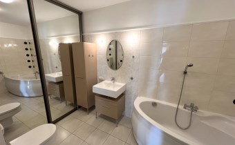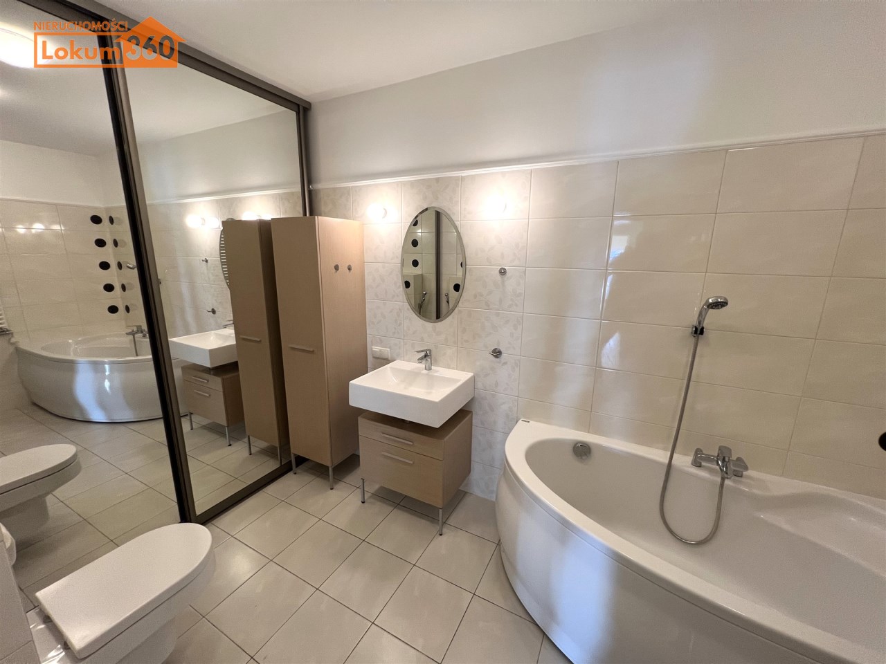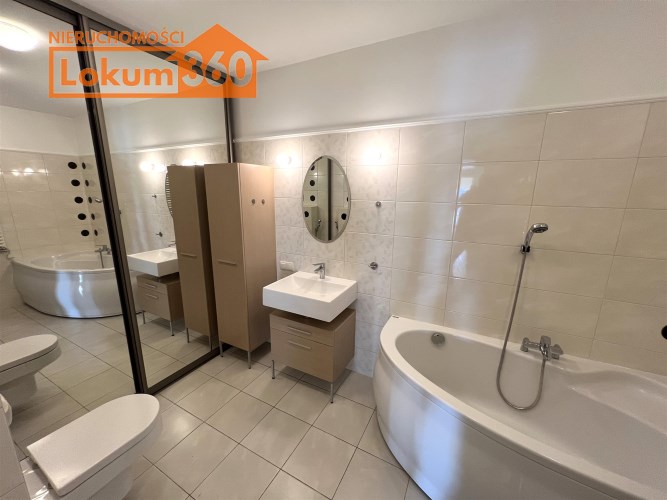 - ŁAZIENKA I, z wanną i prysznicem: 12,44 m², obok głównej sypialni, z wanną narożną i kabiną prysznicową, pralnia oddzielona drzwiami przesuwnymi z lustrem, przygotowane podłączenie pralki oraz słuchawka bidetowa,