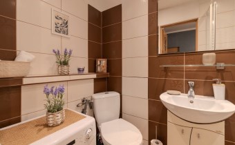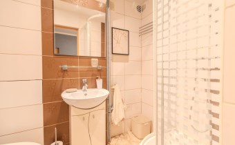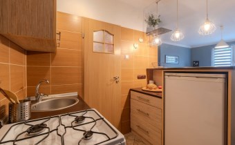 W pokoju i w aneksie kuchennym na podłodze parkiet, łazience i przedpokoju terakota.