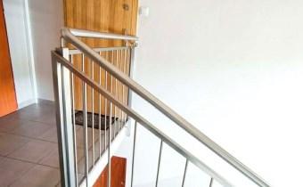 Blok po termomodernizacji, klatka schodowa po remoncie, wejście zabezpieczone domofonem i wyposażone w monitoring.