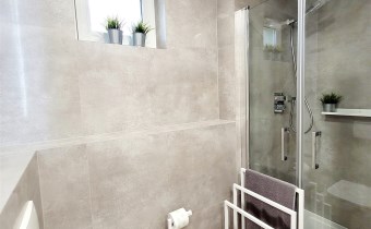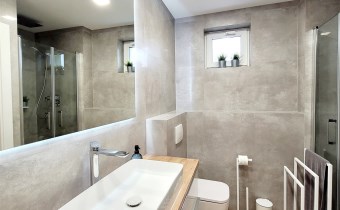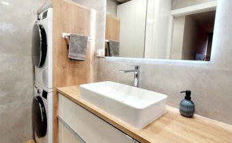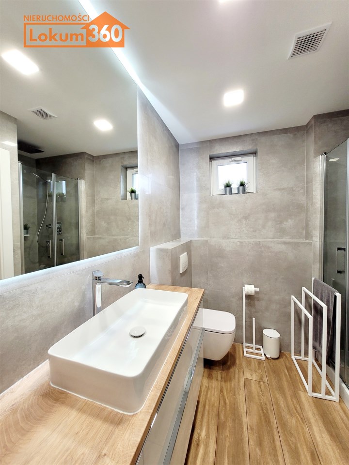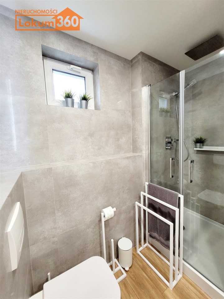 - ŁAZIENKA z WC z OKNEM/ powiększona z części korytarza: płytki, duża kabina prysznicowa, umywalka, meble, miejsce na pralkę oraz suszarkę, podwieszony geberit w zabudowie, szafka wisząca
