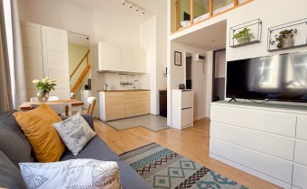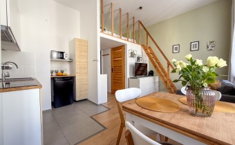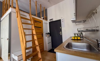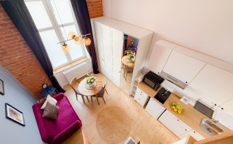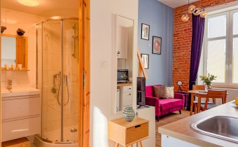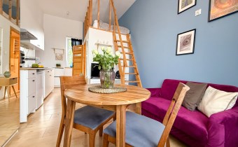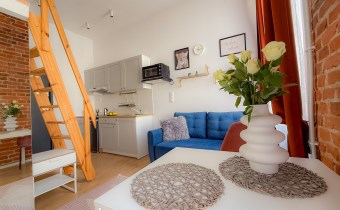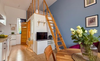 Mieszkanie o powierzchni 75 m2 podzielone zostało na 3 niezależne apartamenty ( 21 m2, 22 m2 i 23 m2) z korytarzem oraz pomieszczeniem gospodarczym, przystosowaną pralnią pod obecne przeznaczenie, każde z aneksem kuchennym, łazienką oraz antresolą. Każde w nieco innym układzie, przemyślane aby wygodnie funkcjonować na co dzień.