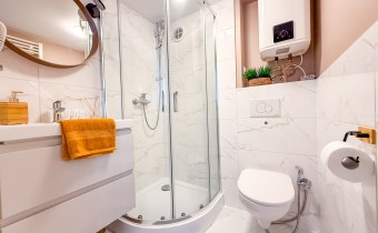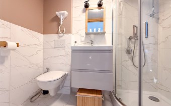 W gustownych łazienkach zamontowano prysznice, umywalki, toalety i bidety.