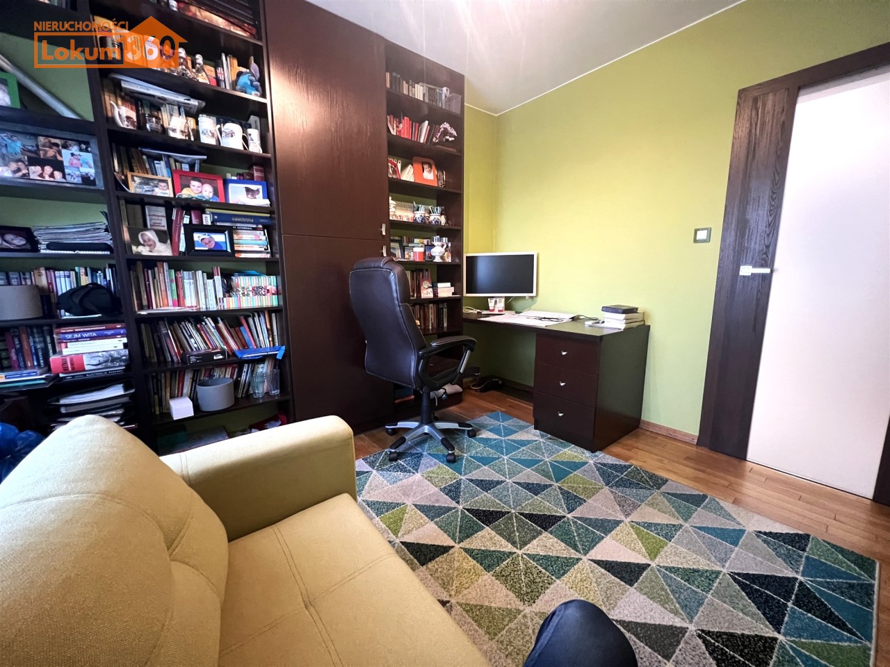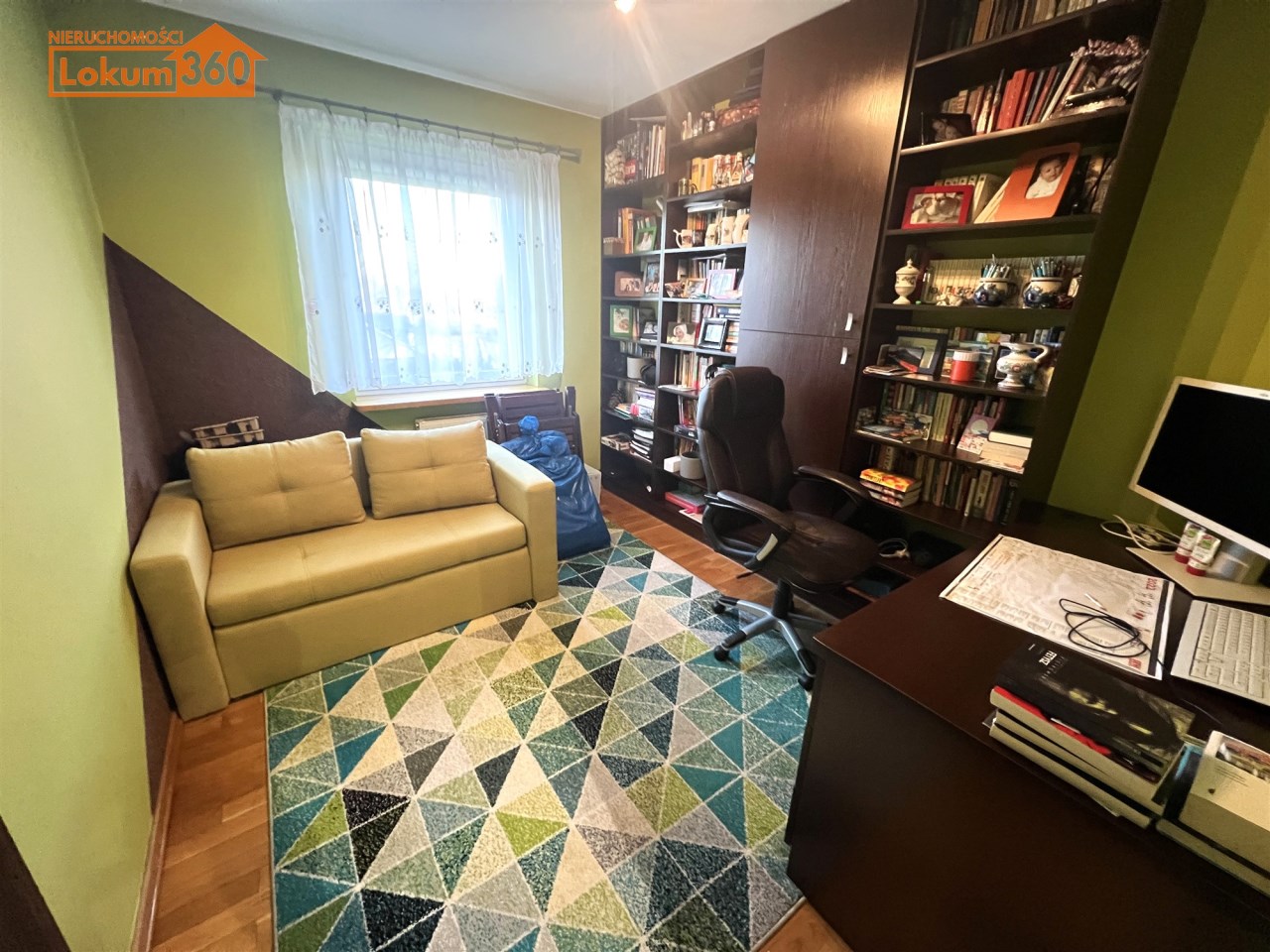 - GABINET/DRUGA SYPIALNIA: 10 m², kanapa rozkładana, duży regał z półkami, biurko z krzesłem na kółkach,