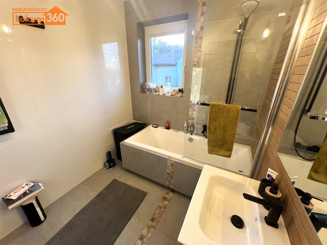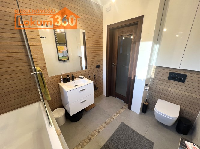 - ŁAZIENKA Z WC: 5,4 m², z oknem, wanna z prysznicem ze szklaną rozkładaną przesłoną, umywalką z szafką podumywalkową, duże lustro wklejone z podświetleniem, sedes podwieszany, duża wbudowana szafka łazienkowa,