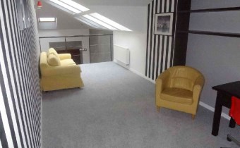 - SYPIALNIA II/ GABINET: na podłodze wykładzina, kanapa rozkładana, biurko, krzesło na kółkach,