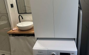 Wyposażenie łazienki kabina prysznicowa, lustro, natrysk, pralka, prysznic, umywalka