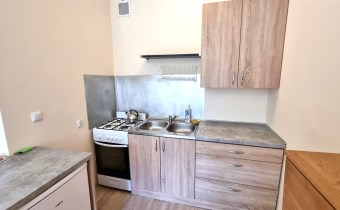 - I POKÓJ:  z aneksem kuchennym ok. 18 m kw, podłoga parkiet po cyklinowaniu, ściany gładzie gipsowe, malowane, kanapa, regał ,