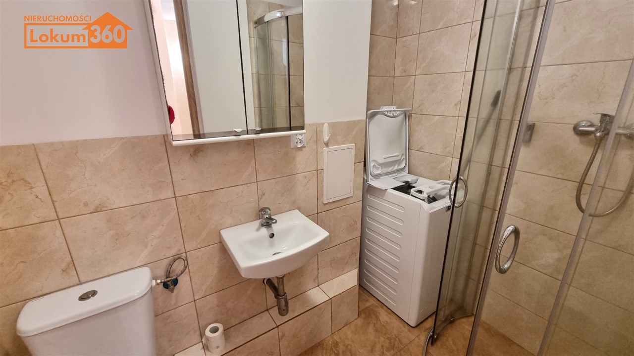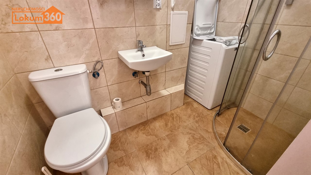 Wyposażenie łazienki kabina prysznicowa, lustro, pralka, umywalka, WC