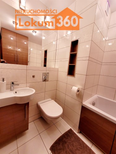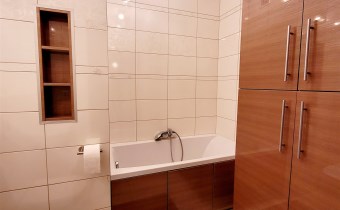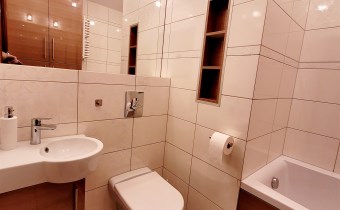 - łazienki połączonej z wc ( wanna) wyposażonej w sprytnie schowaną pralkę,