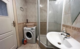 - ŁAZIENKA Z WC: glazura, terakota, kabina prysznicowa, nowa pralka, sedes, bidet, umywalka z nogą, półki szklane,