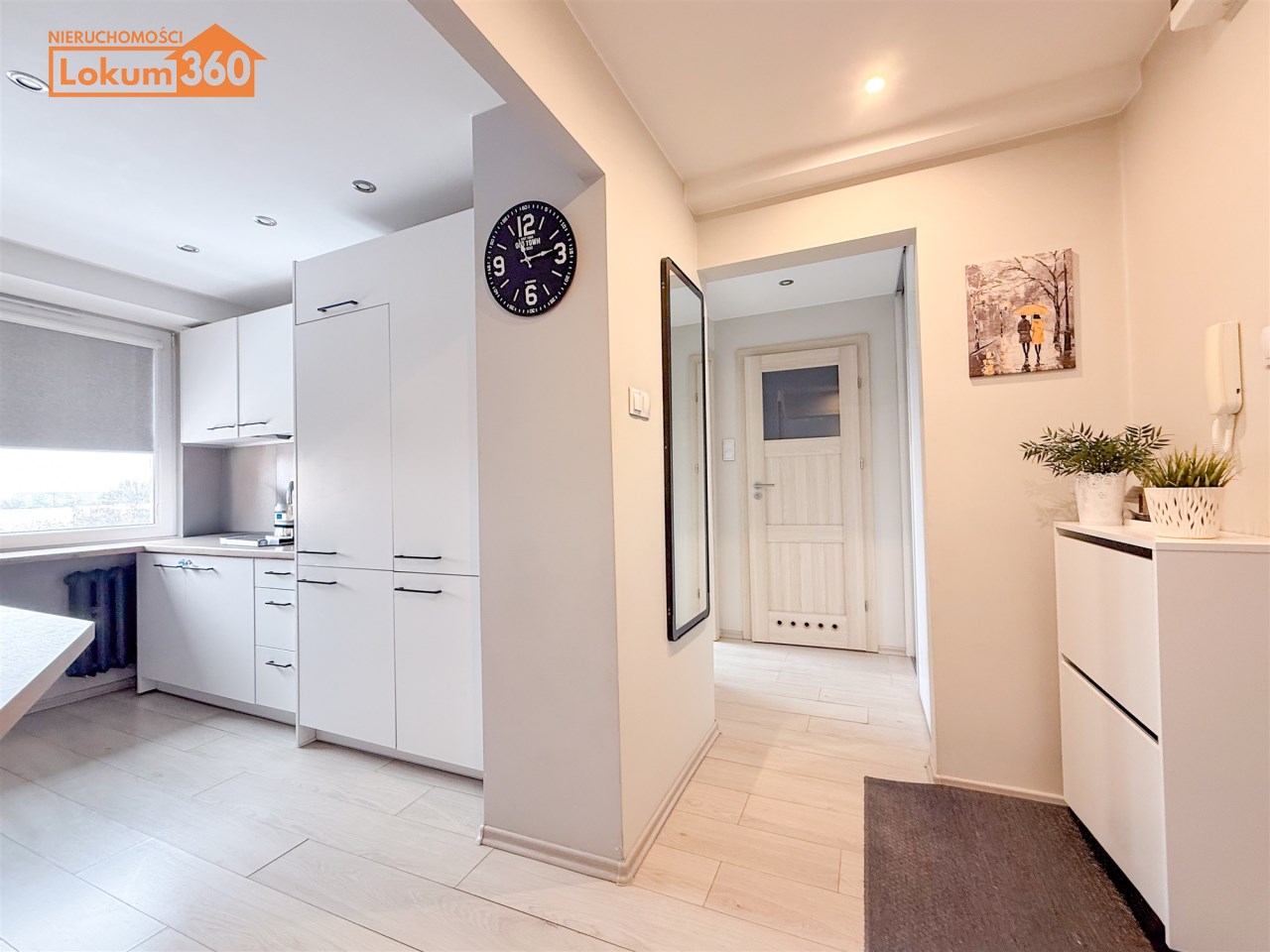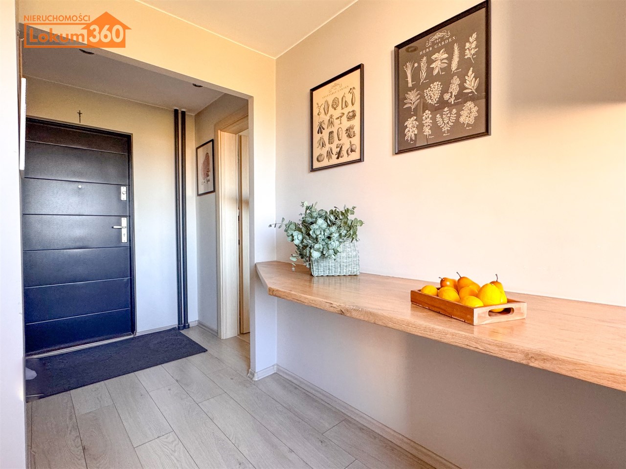 Duży przedpokój z zabudowaną szafą porządkuje przestrzeń.