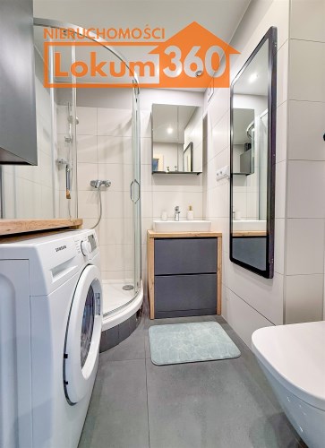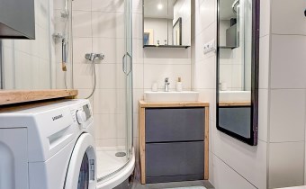 Łazienka w nowoczesnych barwach z dużą kabiną prysznicową, dodatkowo wyposażona w pralkę.